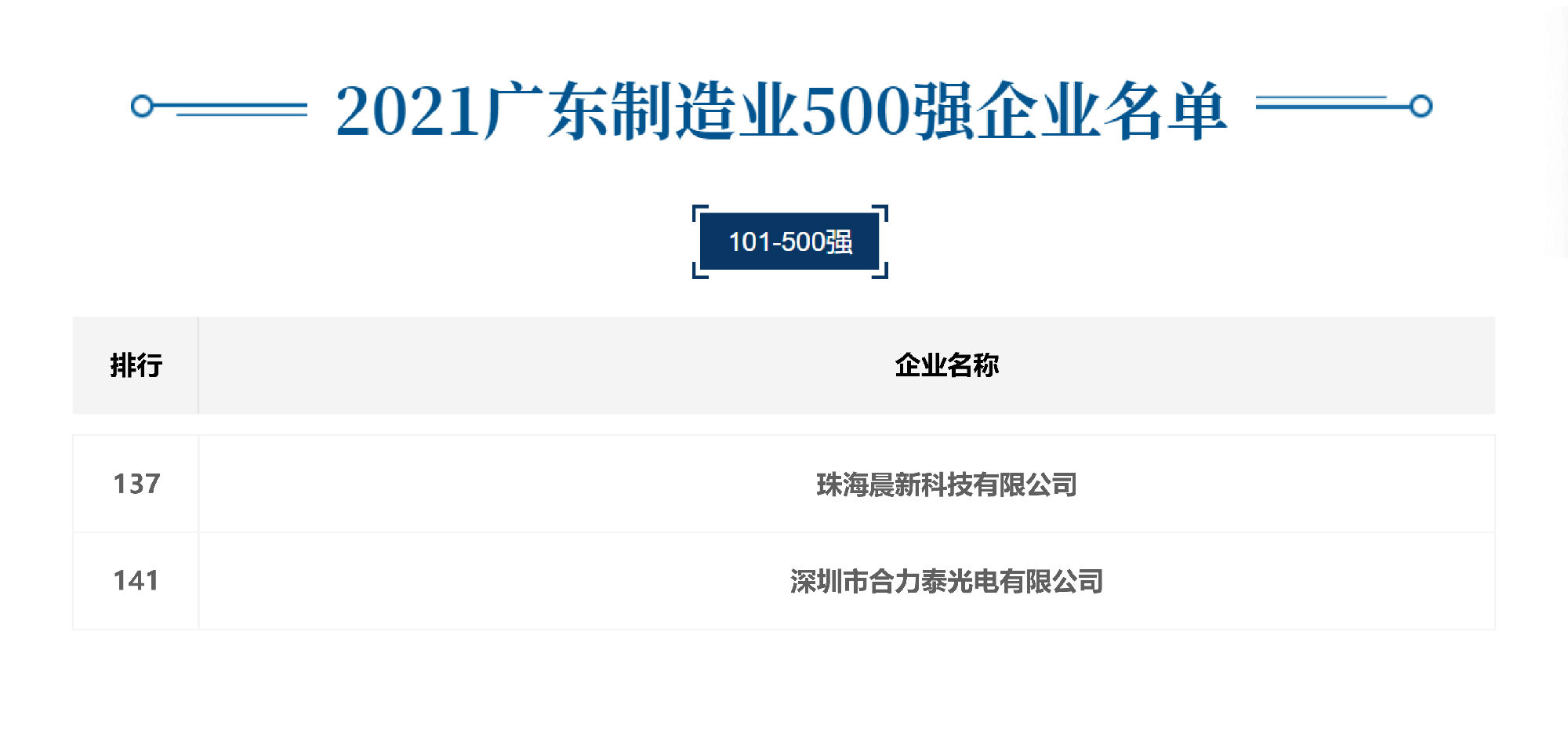 近期,廣東省制造業協會、廣東省發展和改革研究院等機構聯合發布了2021廣東省制造業500強企業名單,合力泰旗下珠海晨新科技有限公司、深圳市合力泰光電有限公司榮登榜單,分別位列第137名、第141名。