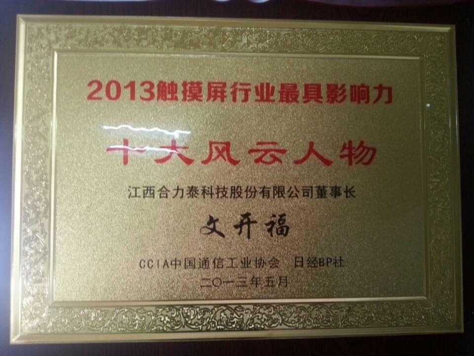 2013年5月23日-25日由中國通信工業協會、日經BP社、中瑞聯合主辦的中國觸摸屏行業最具影響力企業展會在深圳會展中心拉開了帷幕。中國各大電子設備商、日本團等行業組織深度參與,舉辦高規格的會議和展覽,這將是中日高水準的行業盛會; 超過15000名觸控行業高層參與,600多家領先企業參展和5萬多專業人參加。開幕式的第一天即頒獎典禮,出席頒獎典禮的有奇美電子、愛特梅爾、賽普拉斯、嵩達、信利、旭肖子、歐菲光、日本NGK 、漢高、ARM 、深越、南玻、業際、宇順、長江力偉、日立、圣戈班、大族激光、德龍激光、諾信、恒基、漢東等知名企業領導,我公司先后榮獲2個獎項,文開福董事長個人榮獲“十大風云人物”獎項。