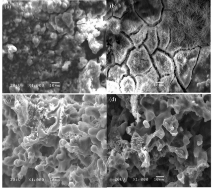 Figure 5. 在不同溶液中,放電后Mg-6wt%Al-1wt%In合金的SEM:(a)在3.5%NaCl和(b)3.5%NaCl+1%PSS/RGO中清洗腐蝕產物之前,(c)3.5%NaCl和(d)3.5%NaCl+1%PSS/RGO清洗后的腐蝕產物。