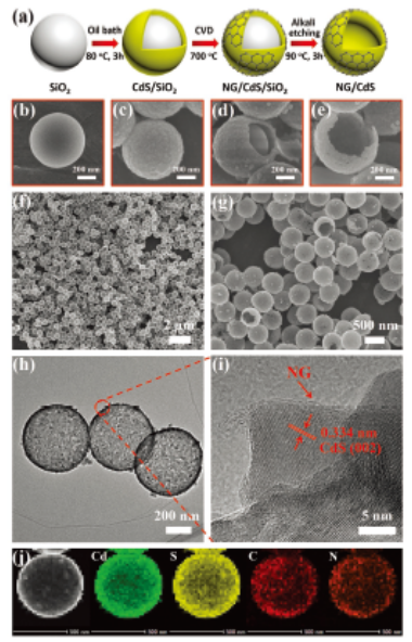Figure 1.(a)NG/CdS HS制備過程示意圖,(b-e)相應的場發射掃描電鏡圖(FESEM),(f,g)CdG2的FESEM圖,(h,i)CdG2的TEM圖, (j)CdG2的STEM圖及其相應的元素漫譜圖。