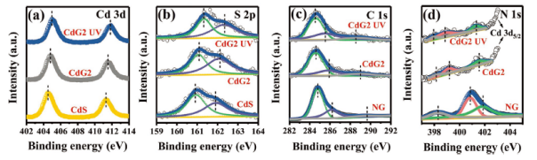 Figure 2. CdS, NG, 和 CdG2在黑暗或UV照射下的高分辨率ISI-XPS譜:(a)Cd 3d , (b)S 2p , (c)C 1s , 和(d)N 1s。