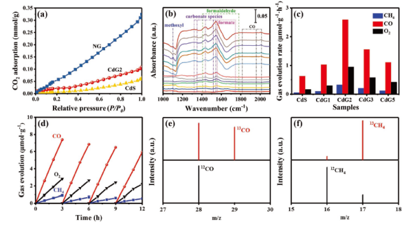 Figure 3. (a)CdS, NG, 和 CdG2的CO2吸附曲線,(b)CdG2的DRIFTS譜,(c)CdS, CdG1, CdG2, CdG3, and CdG5的光催化CO2還原性能表征,(d)CdG2循環性能測試(12次),(e,f)CdG2產生的CO和CH4的氣相色譜質譜聯用(GC-MS)分析。