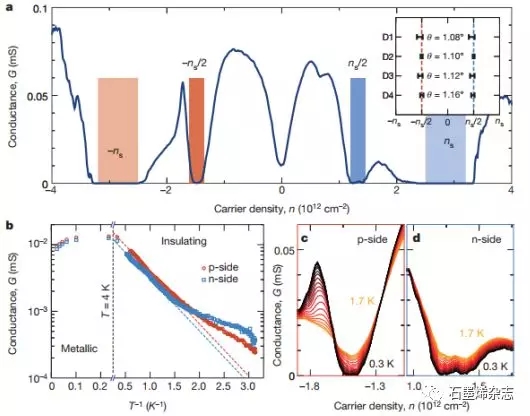 Figure 2.在魔角TBG中的半填充絕緣體狀態(tài)。(a)在1.08°時(shí)測(cè)量魔角TBG器件D1的電導(dǎo),插圖顯示了四種不同器件中半填充絕緣相(HFIP)的密度位置;(b)D1器件中兩個(gè)HFIP的最小電導(dǎo)值;(c-d)分別在p側(cè)和n側(cè)HFIP附近,D1的溫度依賴性的電導(dǎo)(大約從0.3到1.7 K)。