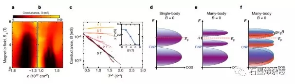 Figure 4.半填充絕緣相的磁場(chǎng)響應(yīng)。(a,b)分別在p側(cè)和n側(cè),D1裝置的HFIP電導(dǎo)的B⊥依賴性;(c)不同磁場(chǎng)下p側(cè)HFIP電導(dǎo)的阿侖尼烏斯曲線圖;(d-f)不同狀態(tài)圖(DOS)的密度。