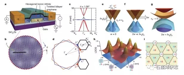 Figure 1.扭曲雙層石墨烯(TBG)的電子能帶結(jié)構(gòu)。(a)TBG裝置示意圖;(b)TBG中看到的莫爾條紋;(c)魔角(1.08°)TBG的能帶;(d)由來(lái)自雙層的兩個(gè)K(K')波矢量之間的差異構(gòu)成的MBZ;(e-g)不同夾層層間雜化示意圖;(h)在1.08°時(shí)E>0,計(jì)算的平帶局部態(tài)密度(LDOS);(i)堆疊順序的簡(jiǎn)化模型的俯視圖。
