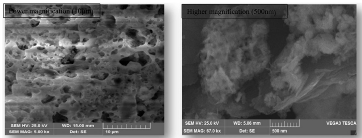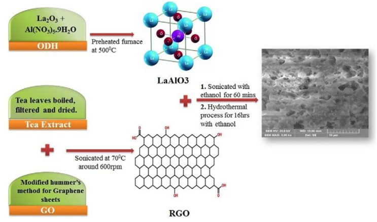 3)和還原氧化石墨烯復合物(RGO)。此處,綠茶提取物用作還原劑,用于將氧化石墨烯轉化為還原氧化石墨烯。使用XRD、SEM、EDAX、FTIR和BET技術對合成材料的形貌進行了表征。該材料用作超級電容器應用的電極材料。電子顯微圖像表明,RGO薄片緊密地附著在LaAlO