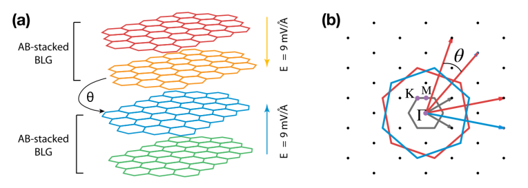 Figure 1. (a)構型示意圖。(b)θ=21.8°(m=1)TDBG的倒數晶格(黑點)和微型布里淵區(灰色六邊形)。