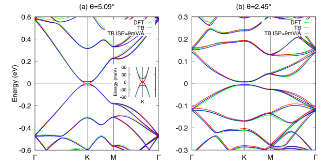 Figure 2. 使用DFT計算的(a)θ=5.09°和(b)θ=2.45° TDBG模型的能帶結構,考慮到緊密結合模型(TB)和固有極化效應的緊密結合模型(TB+ISP)