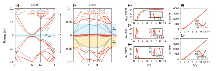 Figure 3. 使用TB+ISP模型計算的(a)θ=2.54°和(b)θ=1.30°的剛性和松弛TDBG的能帶結構。(c-e)帶隙Δ