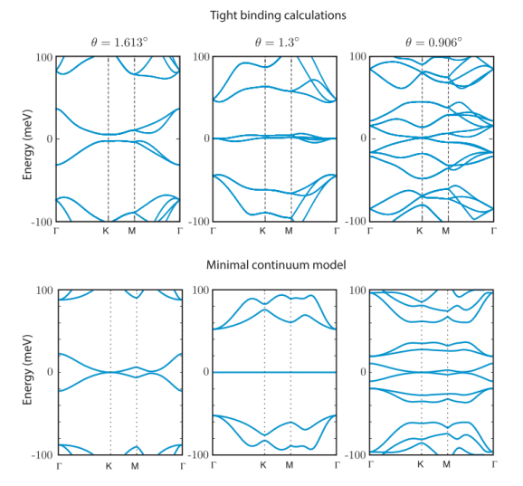 Figure 4. 從具有晶格弛豫和ISP效應的緊密結合模型(上排)和最小連續模型(下排)獲得的魔角θ