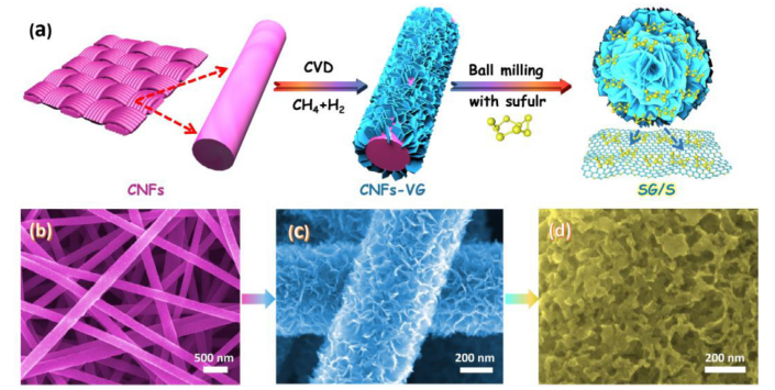 Figure 1. (a)示意圖;(b)CNFs,(c)CNFs上的VG和(d)SG/S的SEM圖像。