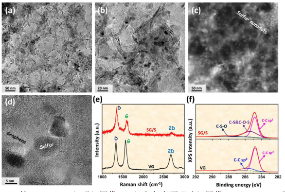 Figure 2. SG/S的TEM:(a,b)明場圖像;(c)高角度環(huán)形暗場圖像;(d)HRTEM圖像;(e)CNFs和SG/S上VG的拉曼光譜;(f)CNFs和SG/S上VG的C 1s光譜。