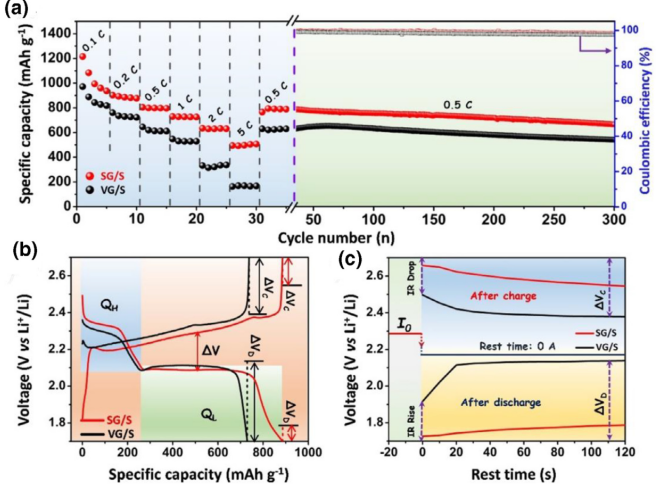 Figure 3. (a)倍率性能測試后,VG/S和SG/S正極在0.1 C至5 C的不同電流密度下放電和充電曲線,以及在0.5 C時的容量變化;(b)比較VG/S和SG/S正極在0.2 C時的恒電流充/放電曲線,以及(c)0.2 C下放電/充電后,VG/S和SG/S的相應(yīng)時間-電壓曲線(V-t)。