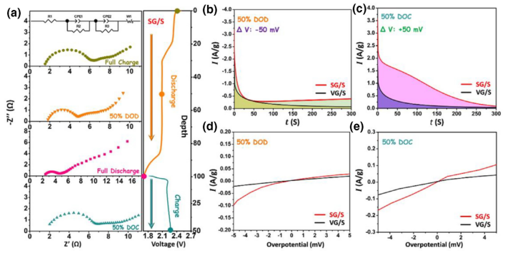 Figure 4. (a)SG/S在不同充放電深度的EIS;在恒定的過電勢下,VG/S和SG/S的計時電流曲線:(b)-50 mV,放電深度為50%;(c)50 mV,充電深度為50%;VG/S和SG/S的線性極化曲線:(d)放電深度為50%,(e)充電深度為50%。