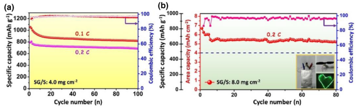 Figure 5. (a)SG/S在0.1 C和0.2 C速率下的循環(huán)性能,硫的質(zhì)量負(fù)載為4 mg cm