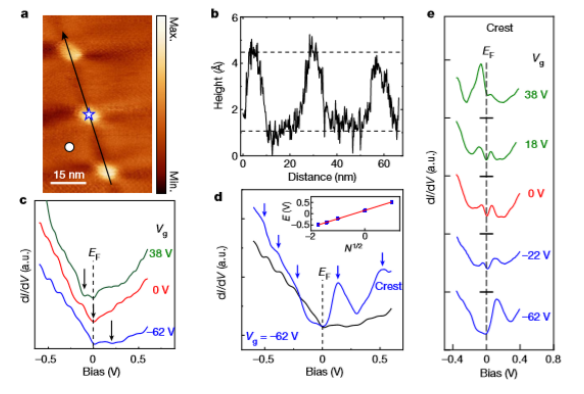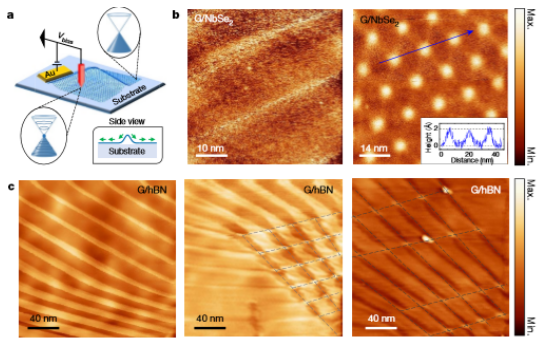 二維原子晶體可以從根本上改變其性能,以響應(yīng)外部影響(例如襯底方向或應(yīng)變),從而形成具有新穎電子結(jié)構(gòu)的材料。例如,雙層石墨烯中由于兩層方向之間的“魔角“而產(chǎn)生的弱色散的“扁平”帶。這些平坦帶中的猝滅動能促進(jìn)了電子與電子的相互作用,并促進(jìn)了強(qiáng)相關(guān)相的出現(xiàn),例如超導(dǎo)性和相關(guān)絕緣體。然而,雙扭曲層石墨烯中獲得魔角所需非常精確的微調(diào),對制造和可擴(kuò)展性提出了挑戰(zhàn)。在這里,我們提出了一種不涉及微調(diào)的扁平帶制備方法。使用掃描隧道顯微鏡和光譜學(xué)以及數(shù)值模擬,我們證明了放置在原子平坦基板上的石墨烯單分子層可能會被迫經(jīng)歷屈曲轉(zhuǎn)變,從而產(chǎn)生周期性調(diào)制的偽磁場,進(jìn)而產(chǎn)生“后磁化”,另一方面產(chǎn)生了平坦電子帶的石墨烯材料。當(dāng)我們使用靜電摻雜將費(fèi)米能級引入到這些平帶中時,我們觀察到態(tài)密度中偽間隙狀耗盡,這標(biāo)志著相關(guān)態(tài)的出現(xiàn)。二維晶體的這種屈曲為創(chuàng)建其他超晶格系統(tǒng)提供了一種策略,尤其是探索了平坦帶特有的相互作用現(xiàn)象。