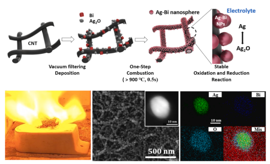 碳基材料中的雙金屬納米結構可以克服能源材料的基本限制,這是單一材料無法獲得的。然而,它們的合成過程耗時且復雜,會導致相/界面偏析和金屬元素分布不均勻。在此,我們報告了一種簡單的燃燒驅動合成雙金屬Ag-Bi納米顆粒(NP)錨定碳納米管(CNT)電極。一步燃燒波通過由Ag