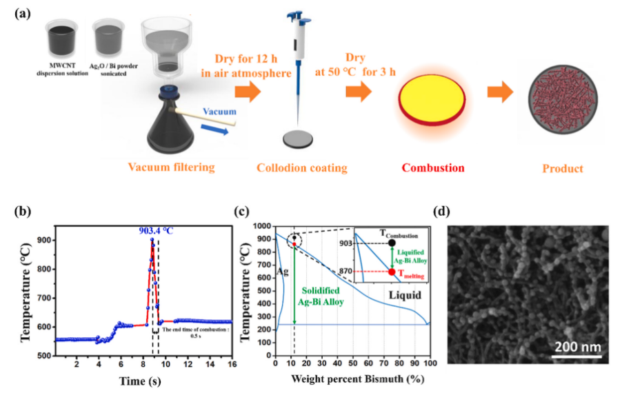 2O、Bi粉末和硝化纖維素組成的前驅體的制備,以及通過燃燒法制備的碳納米管上活性材料的產物。(b)由燃燒引起的熱化學反應的實時溫度變化,導致1 s內的快速加熱-冷卻。(c) Ag-Bi合金的二元相圖。(d)燃燒合成后Ag-Bi NP錨定CNT網絡的SEM圖像。