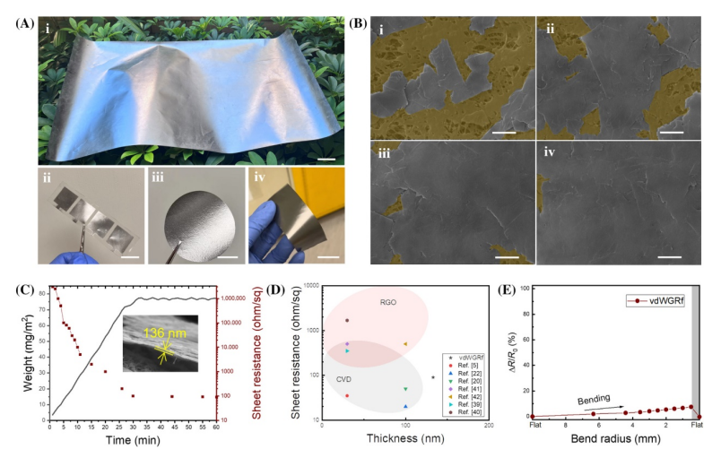 Fig 2. vdWGRfs 的形態學和電學性能。(A) 分別在 (i) 大 (40 cm * 80 cm)、(ii) 光滑 (Nafion®)、(iii) 多孔 (PTFE) 和 (iv) 彈性 (PDMS) 基板上展示的 vdWGRfs 照片。比例尺分別為 5、1、1 和 1 厘米。(B) 多孔 PTFE 基板上 vdWGRfs 形成的順序掃描電子顯微鏡圖像。比例尺,2 微米。(C) PTFE 基 vdWGRfs 的重量變化和薄層電阻隨制備時間的增加而增加。(D) Ashby 圖通過 CVD 和還原方法比較 vdWGRfs 與先前報道的石墨烯薄膜的薄層電阻。5、20、22、39 - 42 ( E ) 基于 PTFE 的 vdWGRf 在彎曲半徑高達 0.5 mm 時的電阻變化。