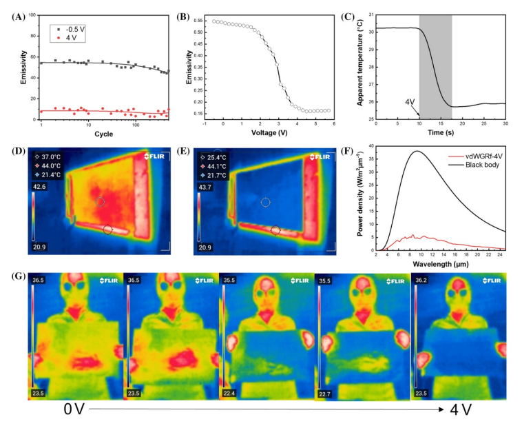 Fig 4. 大面積 vdWGRfs 的 MIR 調節和熱偽裝。(A) 第 10 秒 0–4 V 轉換下的表觀溫度變化。(B) 300 次循環中的發射率調節穩定性,施加電壓為 -0.5 至 4 V。(C) 基于 vdWGRf 的熱調節器在第 300 次循環時的綜合發射率,范圍為 2–15 μm。基于 vdWGRf 的熱調節器在 45°C 電爐上 (D) 0 V 和 (E) 4 V 時的熱圖像。(F) 基于 vdWGRf 的熱調節器在 4 V 時發出的黑體輻射和輻射功率。(G) vdWGRf 在人體連續 0-4 V 下的熱偽裝演示。尺寸:30 厘米寬和 40 厘米長。