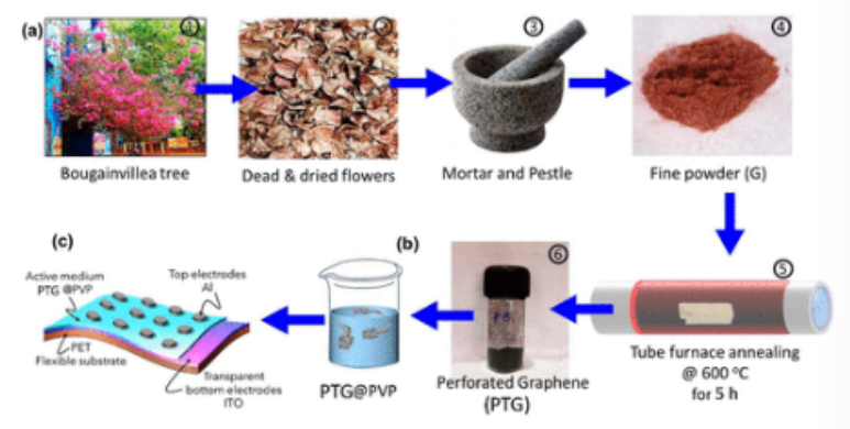利用單步熱解法,從天然廢料--死亡的九重葛苞片中合成了穿孔的渦輪層石墨烯(PTG)片,并首次用它建造了一個電阻開關(RS)存儲器件。在這里,由于石墨烯片的相鄰層之間的渦輪層堆疊,這些大面積的多層石墨烯片的邊緣是高度導電的。這些嵌入在絕緣聚合物基體內的高導電PTG片可以作為電阻式開關存儲器件的活性層。這種混合結構通過簡單的偏置電壓變化在兩個不同的電阻狀態之間顯示出非線性的電阻變化。陷阱輔助的空間電荷限制的傳導可以實現高電阻狀態(HRS),而低電阻狀態(LRS)是通過直接傳導實現的。為了獲得最佳性能的器件,已經進行了一些優化,如聚合物基質的變化、PTG和聚合物濃度的變化、活性層厚度的變化和頂部電極面積的變化。性能最好的器件顯示了電流-電壓數據的可重復性(>200次),低功耗(SET電壓<1 V),高開/關比率(>10