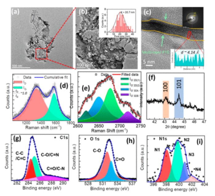 圖2. 合成的PTG的基本特征(a-c)HRTEM分析;(d,e)分別對D和G波段以及2D波段進行拉曼分析;(f)XRD顯示渦輪化;(g-i)分別對C 1s、O 1s和N 1s進行XPS光譜及其解旋。