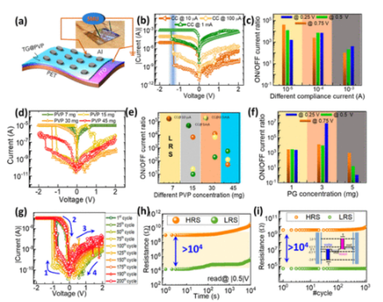 圖1. ReRAM器件的合成和制造過程。(a, b)PTG的合成協議;(c)使用PTG嵌入PVP作為活性層的器件的制造。