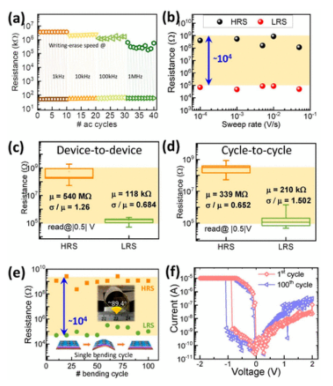 圖4. 電阻狀態和彎曲測試的統計分布。(a) 在1kHz到1MHz的不同寫入和擦除速度下記錄的電阻狀態。(b) 在0.1 mV/s到0.5 V/s的不同掃描速度下,從固定讀取電壓(-0.5 V)的I-V曲線中得到的LRS和HRS變化。(c, d) 分別是十個不同器件(器件對器件)和單個器件的多個周期(周期對周期)的電阻值的統計分布。(e) 彎曲測試期間的LRS和HRS電阻超過100個彎曲周期,一個彎曲周期的示意圖(插圖)。(f) 器件在100個彎曲周期之前和之后的半對數I-V曲線。
