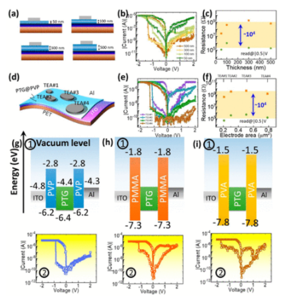 圖5. 不同活性層厚度、頂部電極面積和不同聚合物的I-V特性和電阻狀態的變化。(a) 具有不同活性層厚度的器件示意圖。(b) 具有不同活性層厚度(500、300、100和50納米)的存儲單元在10μA的CC下的典型I-V特性。(c) 不同活性層厚度的HRS和LRS電阻。(d) 具有不同面積的頂部電極的器件示意圖;(e) 具有四個不同面積頂部電極的存儲單元的典型I-V特性。(f) 不同面積的頂部電極的HRS和LRS電阻。(g-i) 3種不同的聚合物,PVP、PMMA和PVA的電流-電壓特性,以及它們各自的能帶圖。