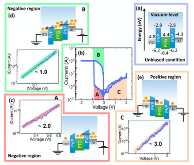 圖6. ReRAM器件在不同電壓區域的電流傳導機制。(a)示意圖展示了無偏壓器件(ITO/PTG@PVP/Al)的能帶圖,(b)圖3g中常見的I-V曲線之一,它顯示了同一器件的重復I-V曲線。(c) 區域A顯示在對數表現中;從數據的線性擬合中,發現斜率為2.0,這是由于陷阱輔助的空間電荷限制電流傳導(SCLC)。(d) 一旦器件處于LRS狀態,如果我們降低電壓,在陷阱電子存在的情況下,新注入的電子會直接傳導,這可以在面板b的B區直觀地看到。插圖顯示了直接導通方法的示意圖。數據的斜率被發現為1.0,這進一步證實了在這個過程中,傳導機制是直接的或歐姆的。 (e) 隨著正電壓的增加,電子的填充不會像負偏壓那樣發生。面板b中的區域C強烈表明了這一點。很少的電子可以通過隧穿穿過勢壘,而在施加正向偏壓時,只有非常少的電子被通過。擬合曲線中的高斜率值支持陷阱輔助的SCLC類型的傳導。