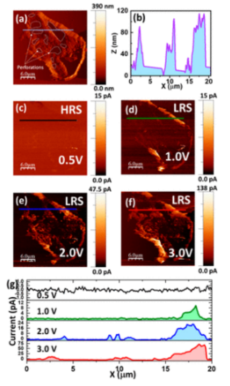 圖7. PTG的CAFM分析。(a, b) PTG片的典型AFM圖像,顯示了片的穿孔。PTG的平均高度是80-120納米,線狀圖清楚地顯示了PTG片內部存在穿孔,PTG的濃度在邊緣,(c-g)CAFM研究,已經使用接觸模式完成,尖端連接到地面,偏置電壓被施加到樣品上。c-f板塊顯示了電流圖,g板塊顯示了在不同的外加偏壓(0.5到3V)下電流變化的相應線型。