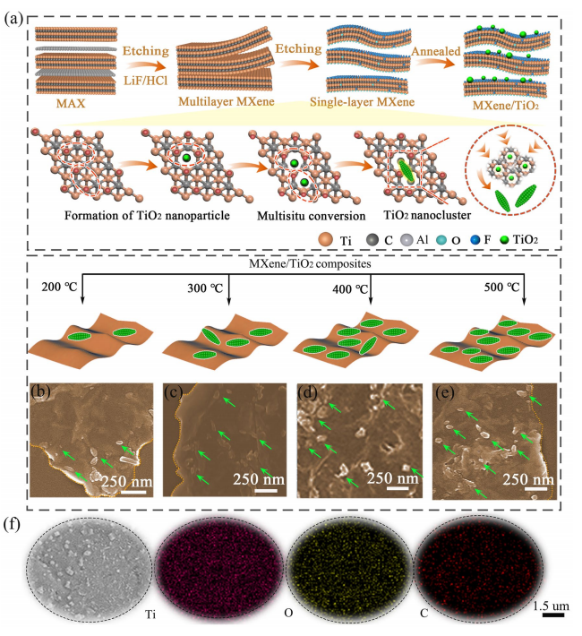 元素分布:圖1f通過EDS映射證實TiO?納米團簇均勻錨定在MXene表面,形成兩相復合結構。