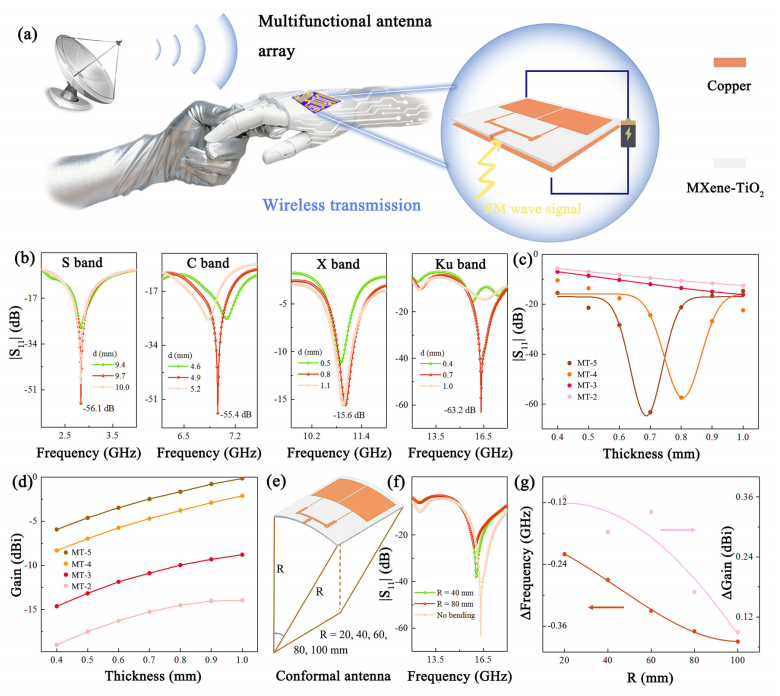 該天線陣列通過MXene/TiO?雜化材料的原位原子重構工程,實現了電磁響應定制化,兼具寬頻帶、高增益和機械柔性,適用于多頻譜隱身與智能蒙皮應用。