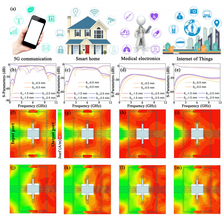 · j-m:阻帶頻率下的表面電流分布,呈現明顯的渦流耗散特征,表明雜化材料通過介電損耗與磁損耗協同實現帶外抑制。