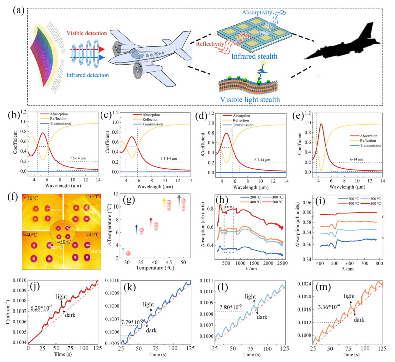 · a:紅外隱身(3–5 μm和8–14 μm波段)與可見光隱身(380–780 nm)協同作用機制示意圖。