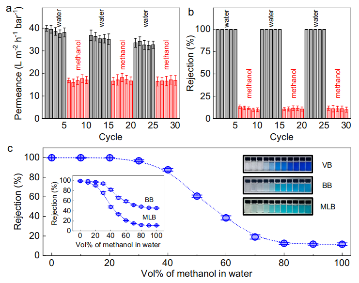 · 在水中,膜表現(xiàn)出與純GO膜相當(dāng)?shù)姆肿恿拷亓糁担∕WCO=319 g·mol?¹),滲透率達(dá)45.52 L·m?²·h?¹·bar?¹;在甲醇中MWCO可逆切換至960 g·mol?¹,滲透率為13.56 L·m?²·h?¹·bar?¹。通過水/甲醇交替,VB染料截留率可逆切換(100%↔15%),實現(xiàn)動態(tài)篩分調(diào)控。