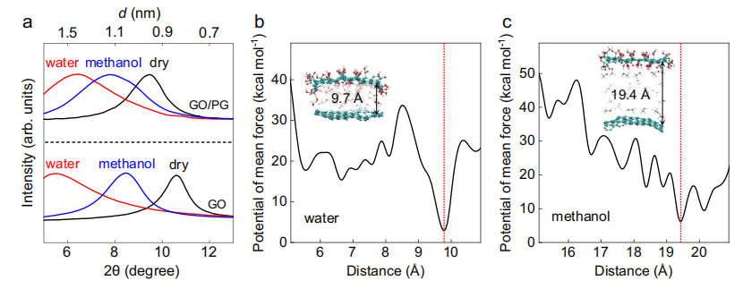 通過XRD與自由能計算,揭示溶劑極性調(diào)控GO/PG膜層間距的物理化學(xué)機制。
