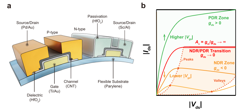 圖1 | CMOS碳納米管薄膜晶體管結(jié)構(gòu)及其門極調(diào)控負微分電阻(NDR)行為與本征增益奇點示意圖