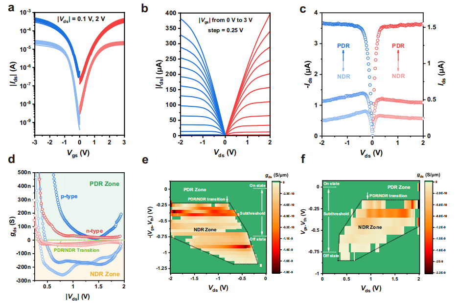 通過高分辨率測量(Vds步進0.01/0.02 V),在亞閾值區(qū)捕捉到負微分電阻(NDR)向正微分電阻(PDR)的動態(tài)轉(zhuǎn)變過程,輸出電導(dǎo)gds(=∂Id/∂Vds)的負正極性反轉(zhuǎn)驗證雙極性導(dǎo)電的物理機制。