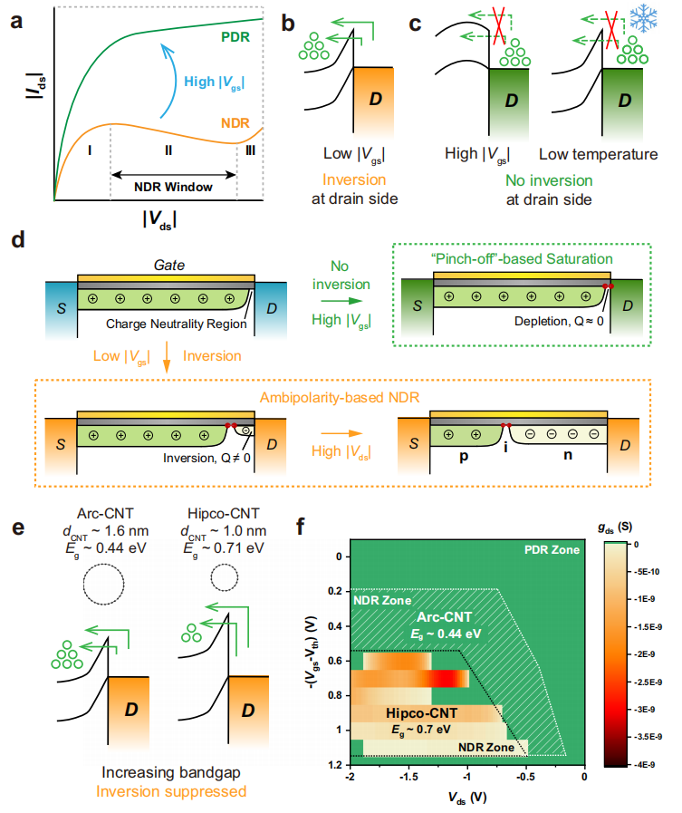 *帶隙相關(guān)性(e-f):柵壓對NDR/PDR邊界的控制源于碳納米管帶隙(~0.6–1.0 eV)對載流子濃度的敏感調(diào)制。
