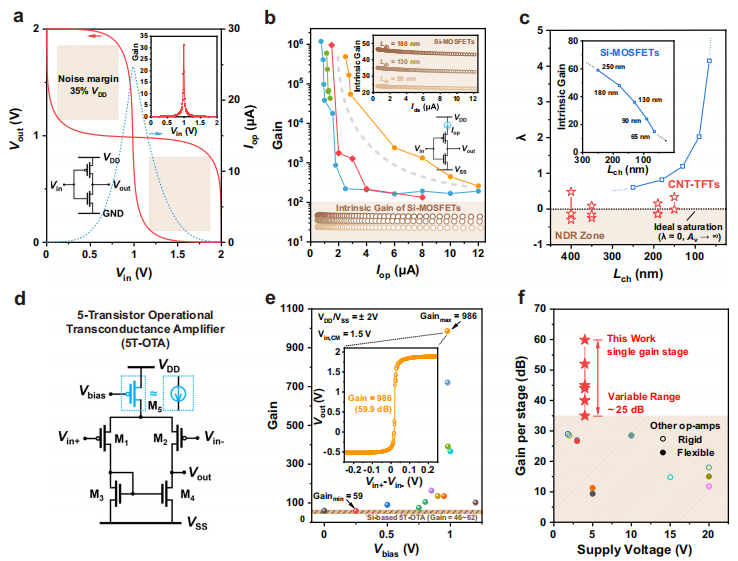 圖4 | 碳納米管薄膜晶體管(CMOS CNT-TFT)本征增益奇異性及電路級應(yīng)用